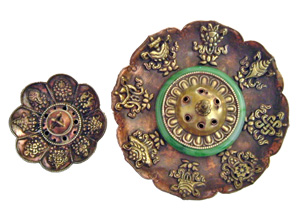 Everything you might need, including portable altars, vases, rice pots, offering bowls, butter lamps, mandala offering sets, incense and incense burners, conch shells, meditation cushions, altar and statue cloths, bell and dorje covers, katas, musical instruments, auspicious symbols, offering statues designed by monks, and handmade Tibetan altar boxes.
